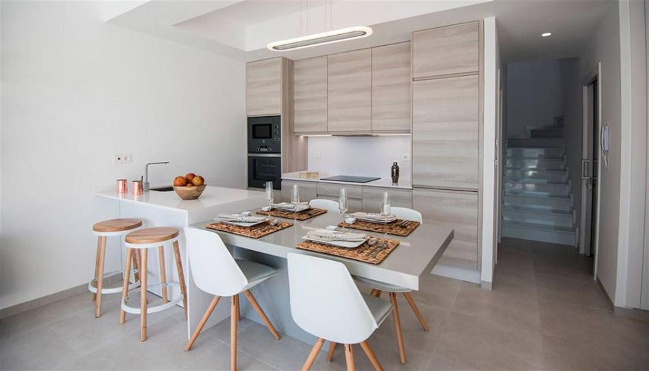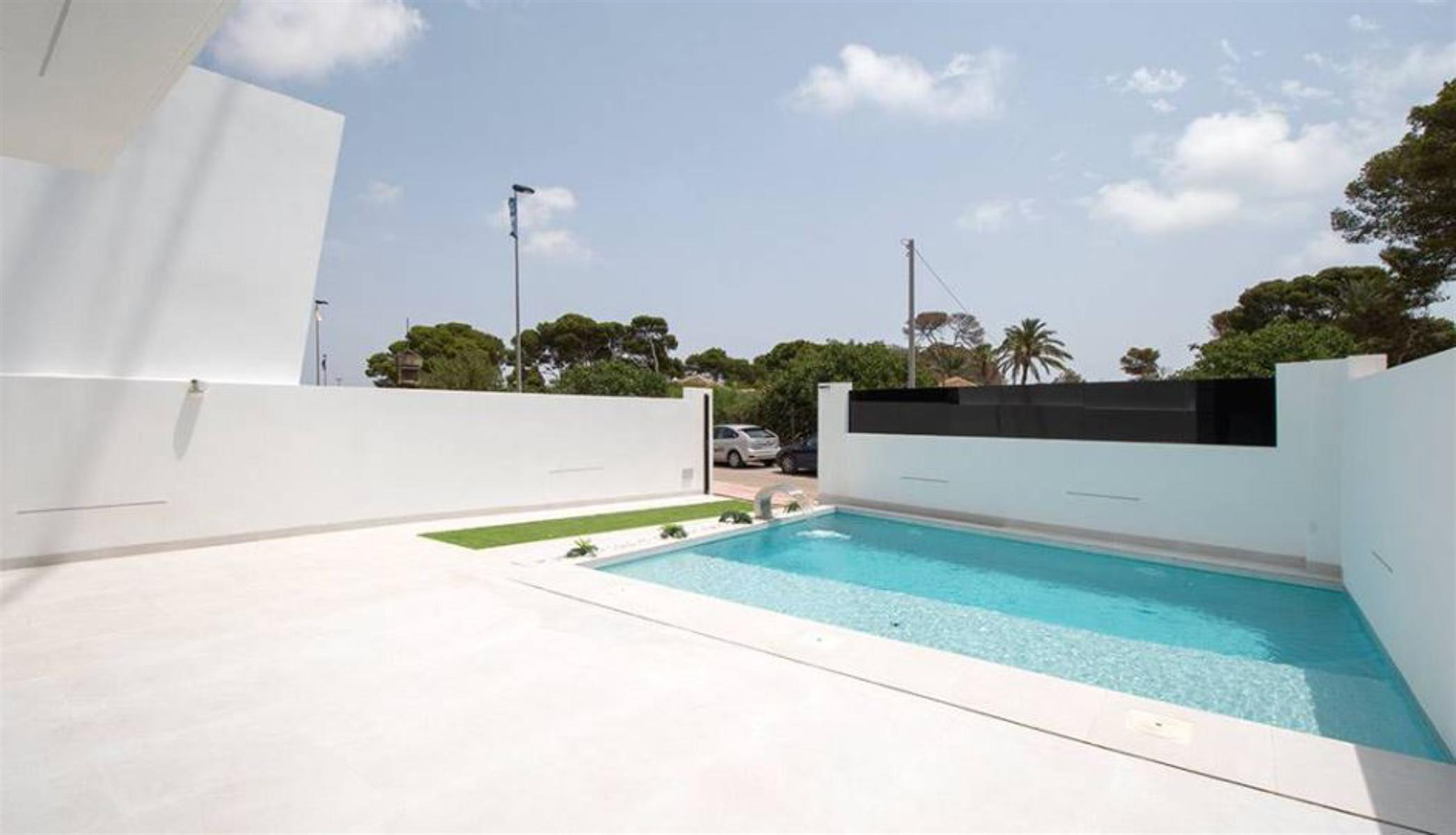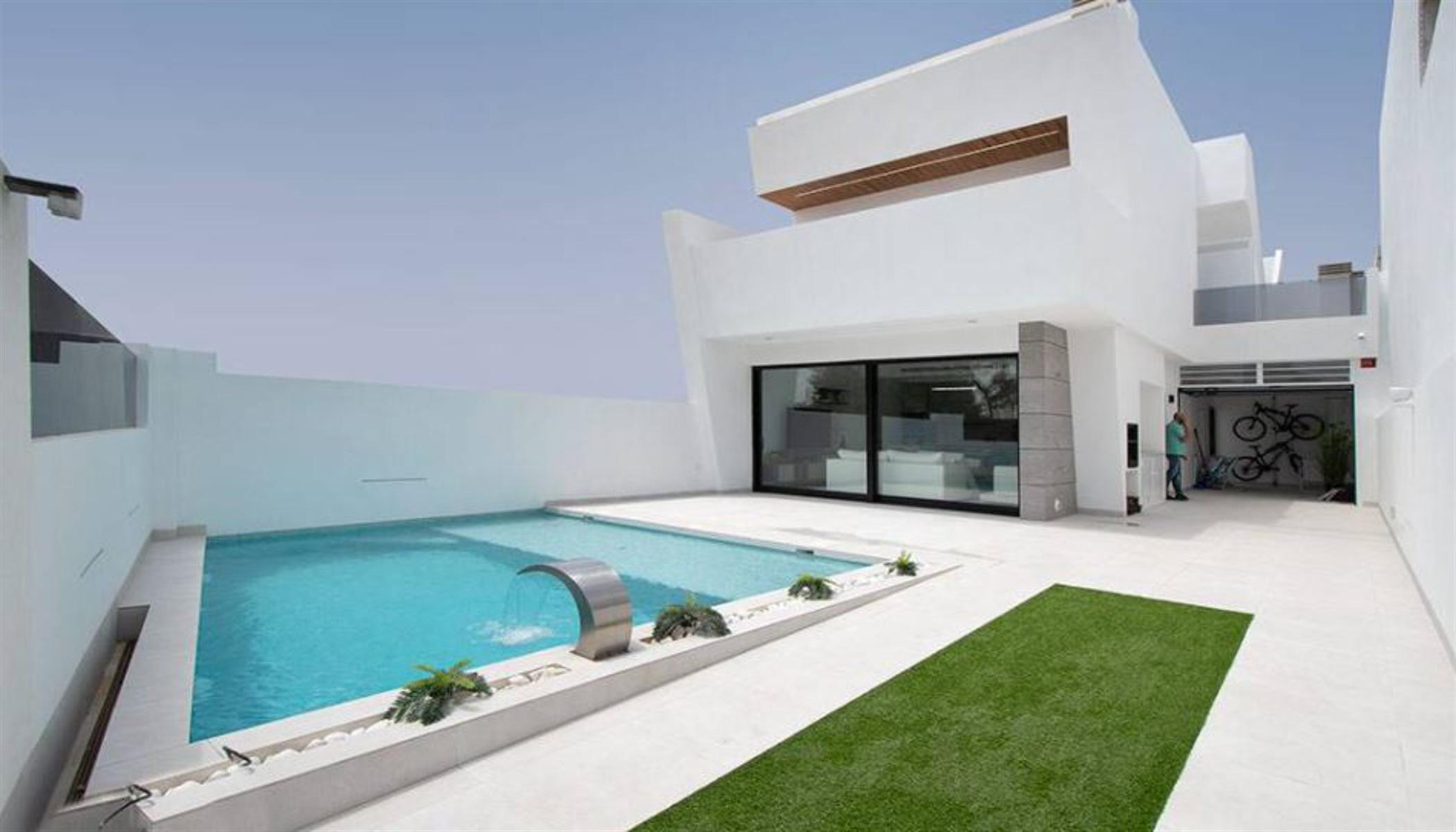 Prijzen vanaf € 329 000 – € 339 950 Nieuw vrijgegeven project van exclusieve villa’s, op loopafstand van de stranden van de Mar Menor. Gelegen aan de Costa Cálida, dicht bij alle noodzakelijke voorzieningen. De omgeving van Santiago de la Ribera biedt voor elk wat wils, van watersportliefhebbers, natuurliefhebbers tot shoppers. Het gebied is goed verbonden met andere grote steden zoals Murcia en Orihuela Costa, terwijl de nieuwe internationale luchthaven van Murcia slechts 40 minuten rijden met de auto is. Deze villa’s met 2 verdiepingen zijn gebouwd op percelen van 177 m² en hebben 3 slaapkamers en 3 badkamers. Op de begane grond is er een grote woonkamer met en een volledig uitgeruste open keuken met grote ramen die uitkomen op de betegelde tuin en het zwembad. Op dezelfde verdieping is een slaapkamer met tweepersoonsbed en een badkamer. Op de 1e verdieping zijn 2 slaapkamers en 2 badkamers, elk met toegang tot het grote terras van 18.50m2. Een van deze slaapkamers heeft een eigen badkamer en een inloopkast. Inbegrepen in de prijs is compleet AC-systeem, Keukentoestellen, gesloten garage met elektrische deur en zomerkeuken. Het is mogelijk om de woning te personaliseren, met verschillende voorbeeldkeuzes. Bouwjaar: 10 maanden