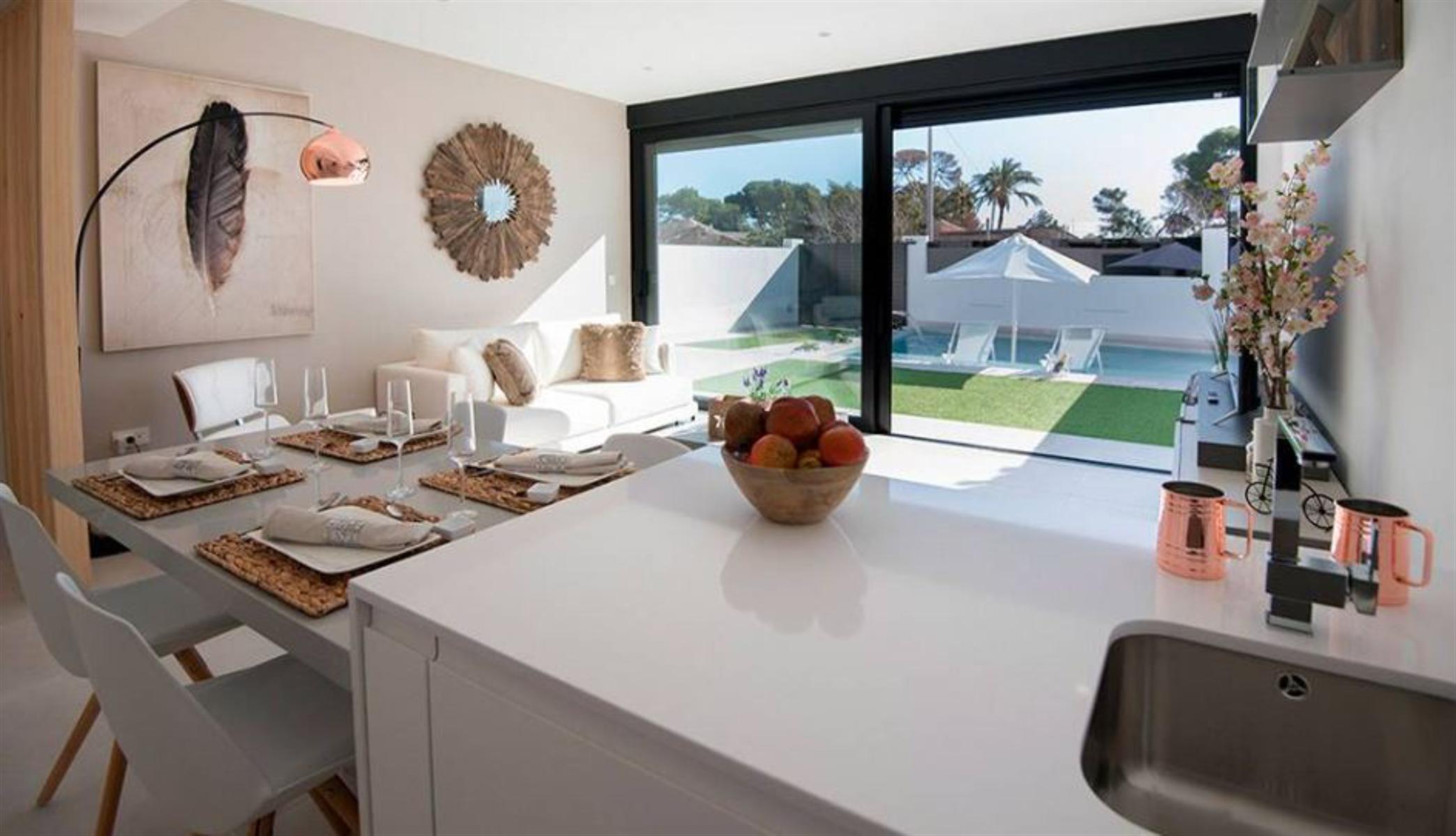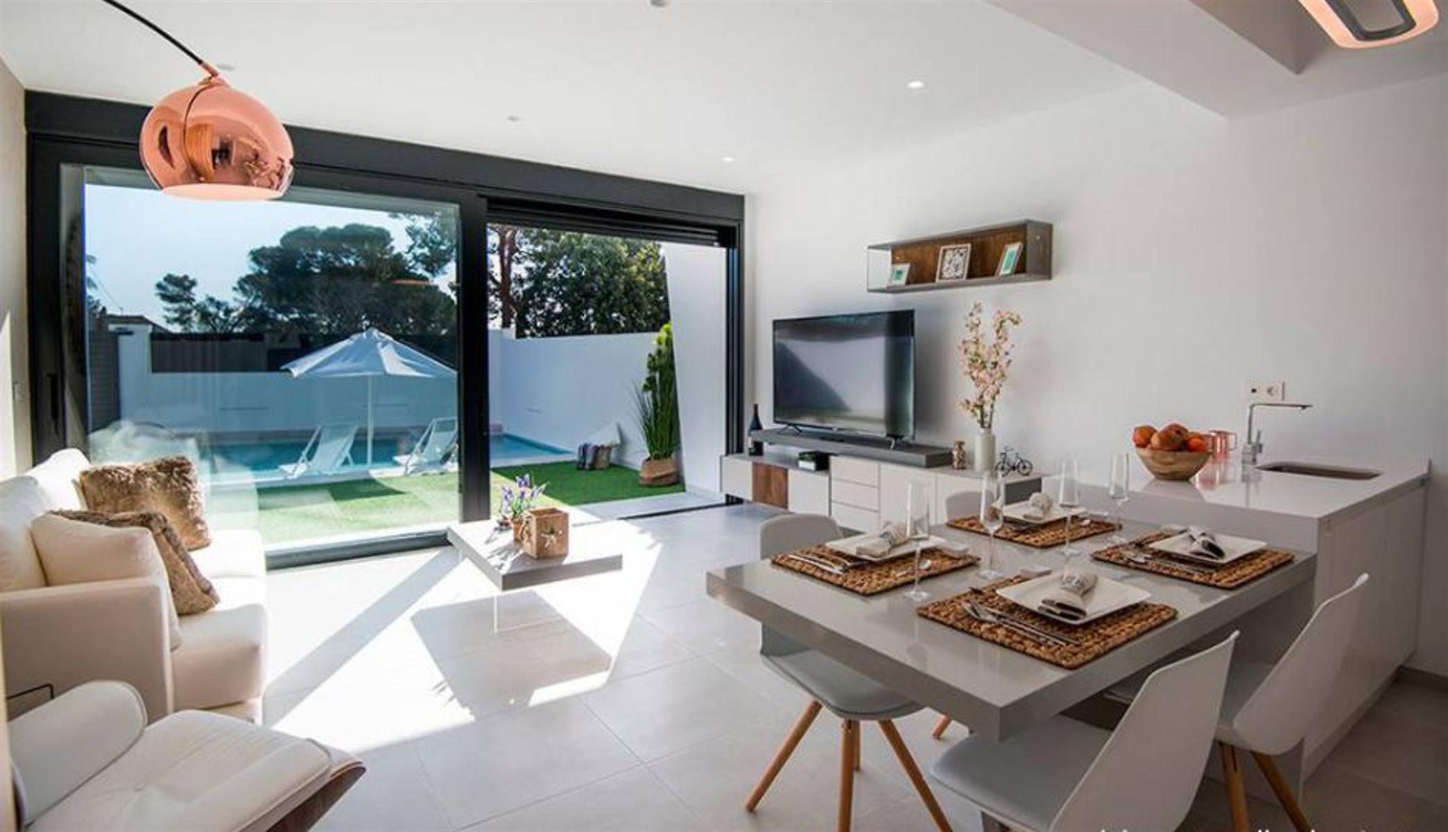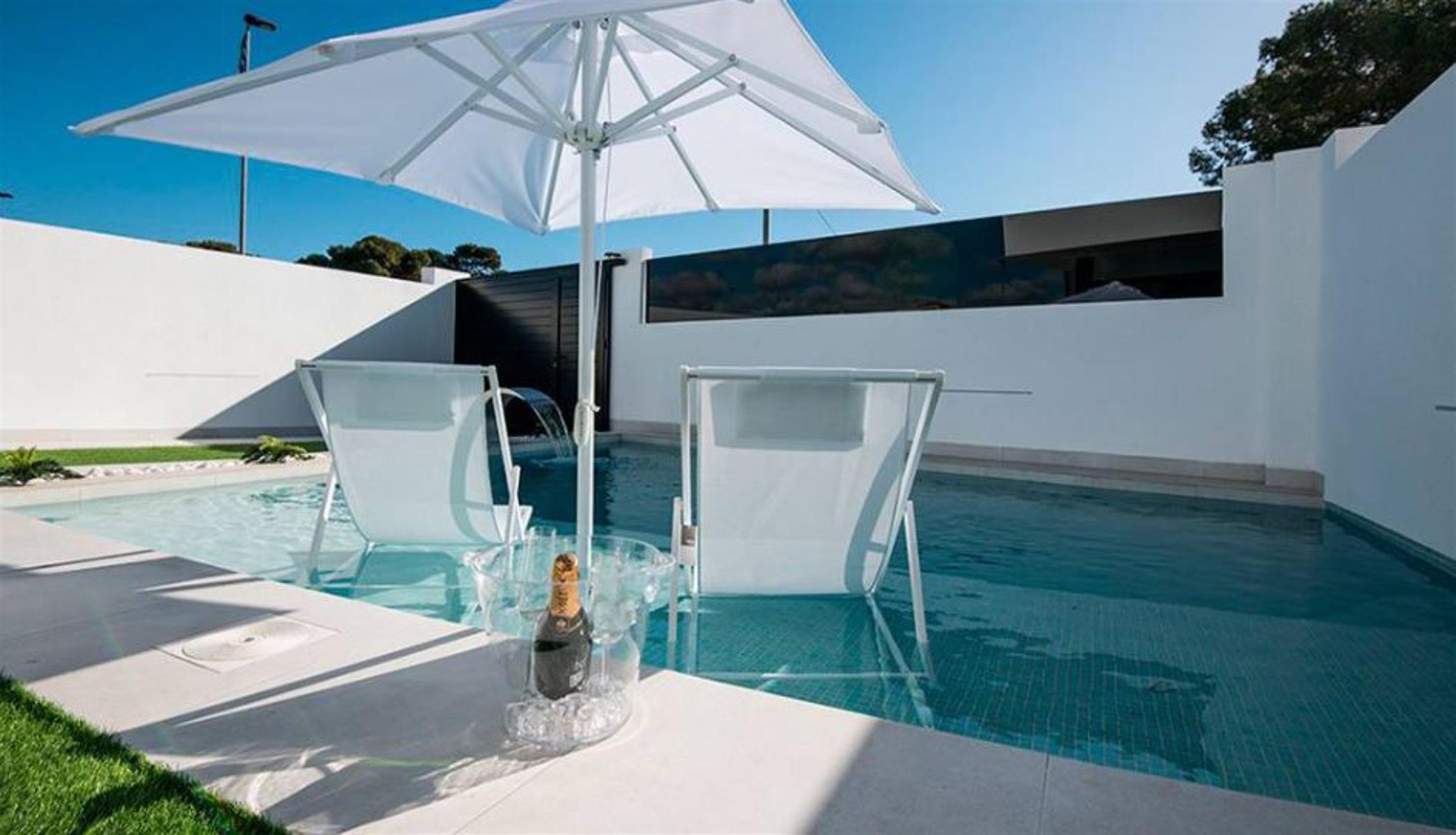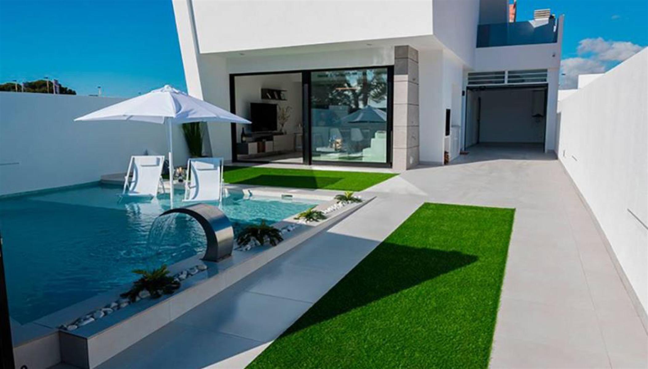 Prijzen vanaf € 329 000 – € 339 950 Nieuw vrijgegeven project van exclusieve villa’s, op loopafstand van de stranden van de Mar Menor. Gelegen aan de Costa Cálida, dicht bij alle noodzakelijke voorzieningen. De omgeving van Santiago de la Ribera biedt voor elk wat wils, van watersportliefhebbers, natuurliefhebbers tot shoppers. Het gebied is goed verbonden met andere grote steden zoals Murcia en Orihuela Costa, terwijl de nieuwe internationale luchthaven van Murcia slechts 40 minuten rijden met de auto is. Deze villa’s met 2 verdiepingen zijn gebouwd op percelen van 177 m² en hebben 3 slaapkamers en 3 badkamers. Op de begane grond is er een grote woonkamer met en een volledig uitgeruste open keuken met grote ramen die uitkomen op de betegelde tuin en het zwembad. Op dezelfde verdieping is een slaapkamer met tweepersoonsbed en een badkamer. Op de 1e verdieping zijn 2 slaapkamers en 2 badkamers, elk met toegang tot het grote terras van 18.50m2. Een van deze slaapkamers heeft een eigen badkamer en een inloopkast. Inbegrepen in de prijs is compleet AC-systeem, Keukentoestellen, gesloten garage met elektrische deur en zomerkeuken. Het is mogelijk om de woning te personaliseren, met verschillende voorbeeldkeuzes. Bouwjaar: 10 maanden